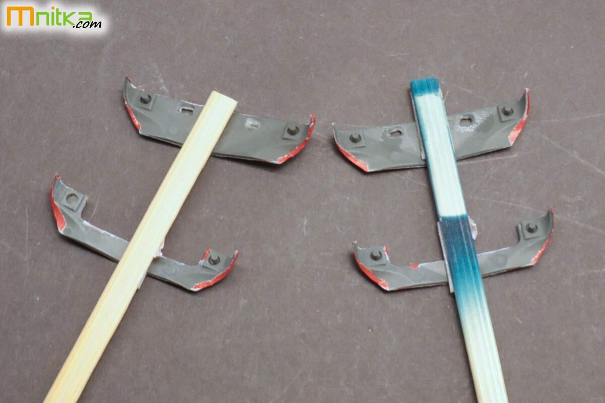 Pluhy z lícové strany nejdříve nastříkám lesklou bílou barvou. Pro jednoduchou manipulaci jsou pluhy oboustrannou lepící páskou přilepeny ke dřevěným míchátkům nápojů.
