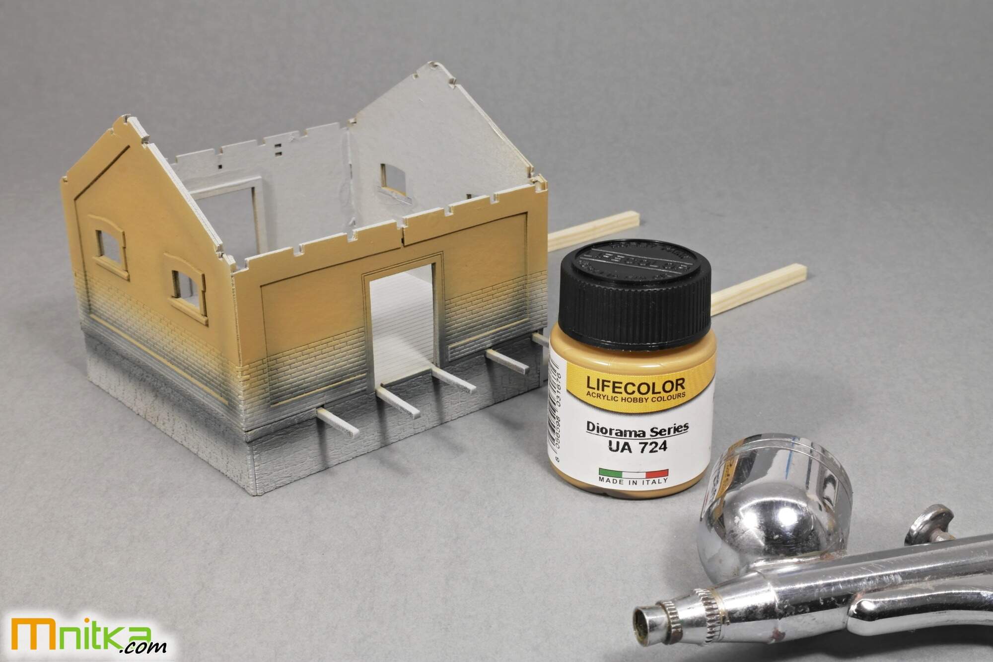 Základní barvu dostala stavba ze spreje. Na obrázku je skladiště sestaveno z části nasucho.