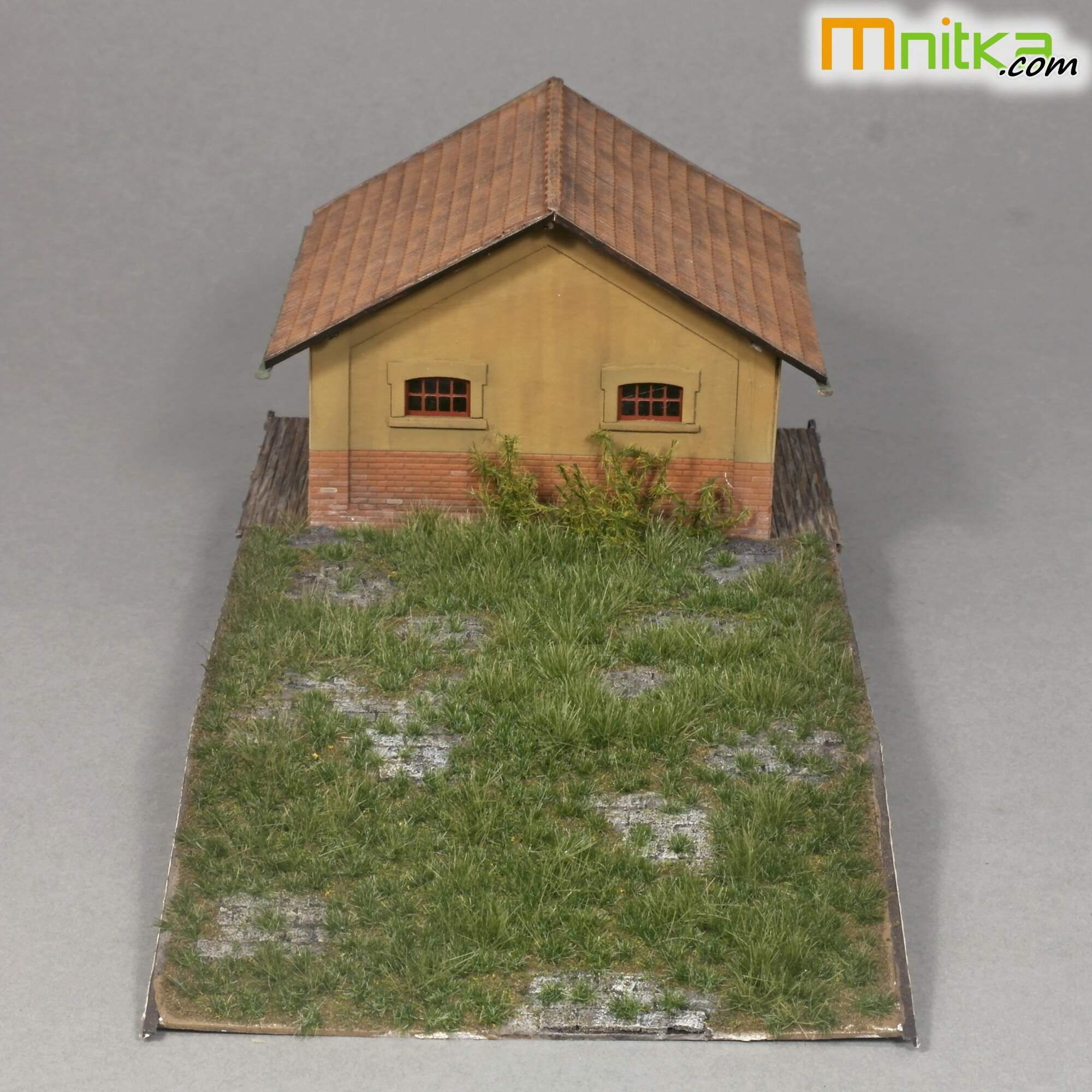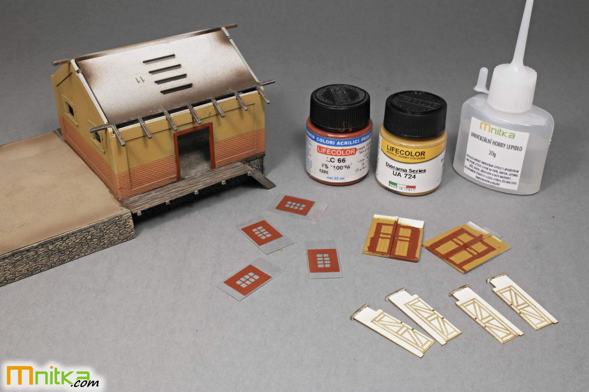 S vraty standardně dodávanými ve stavebnici jsem nebyl spokojen, proto jsem z plastových profilů a desek vyrobil vrata dle skutečnosti. Červenohnědou barvou jsem nabarvil rámy oken, zárubně vrat, na vrata samotná byly použita barva fasády a červenohnědá barva.
