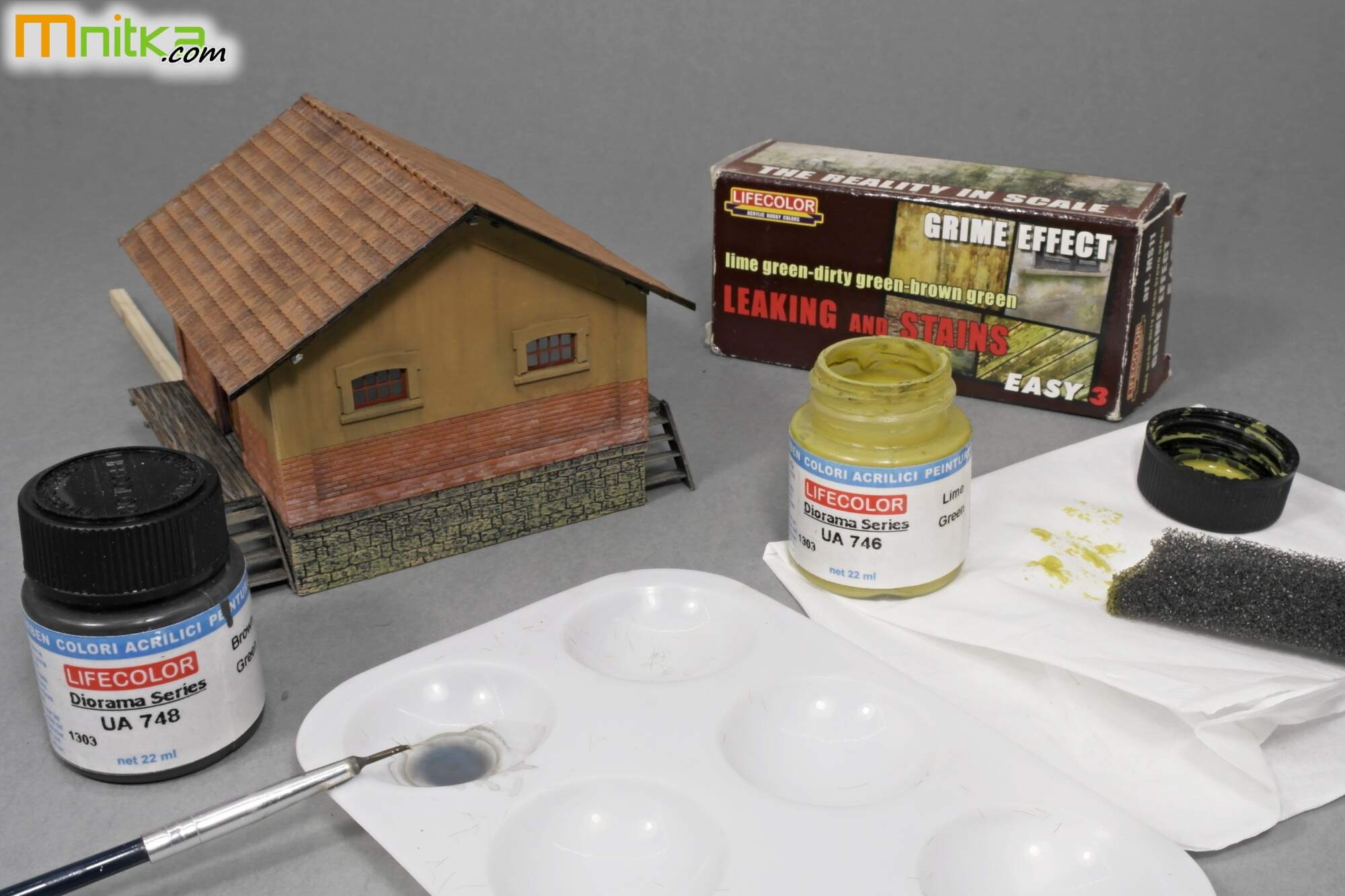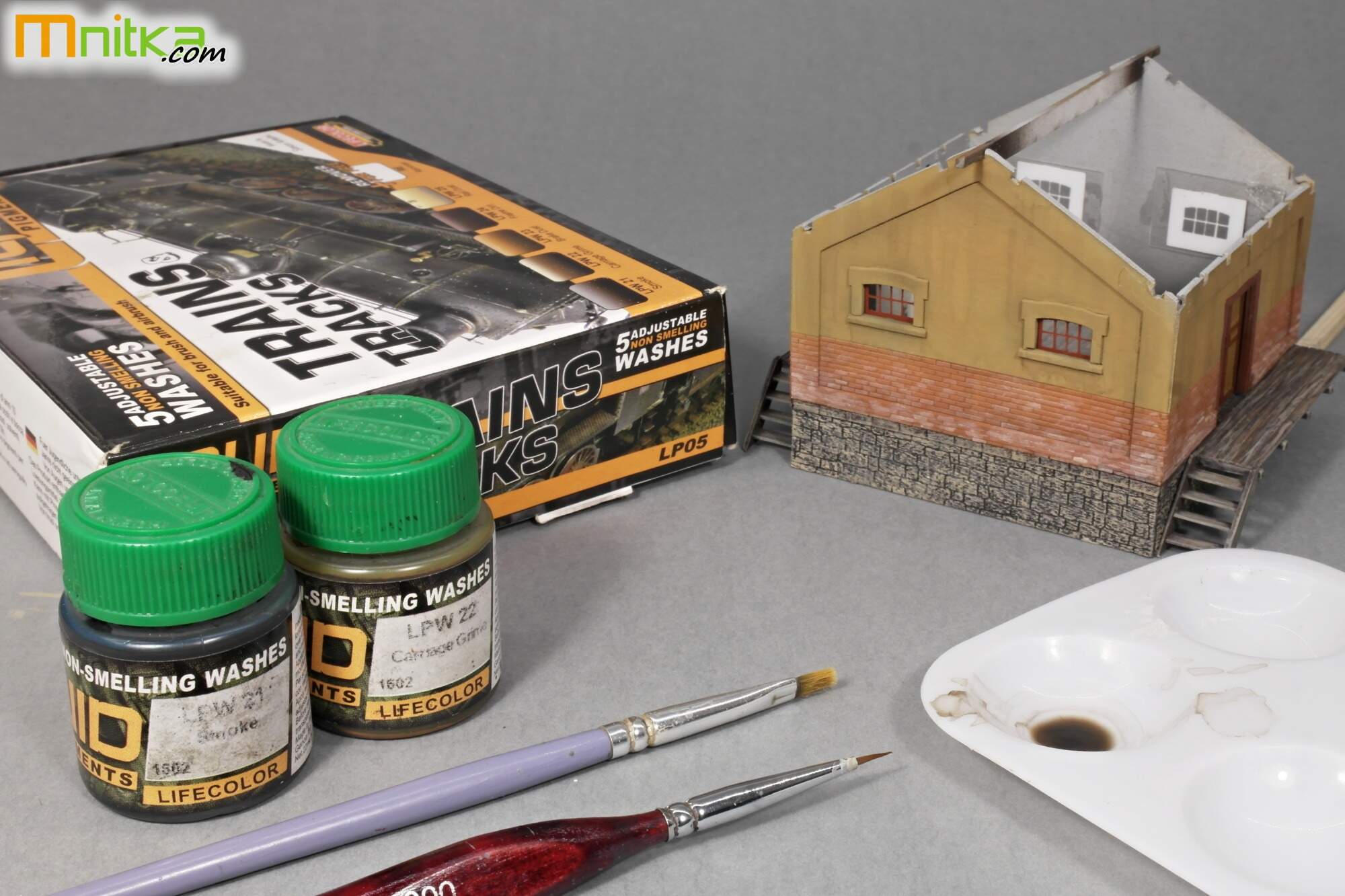 Stékající a usazená špína je znázorněna tekutými pigmenty LPW21 a LPW22 rozmývanými plochým štětcem vodou.