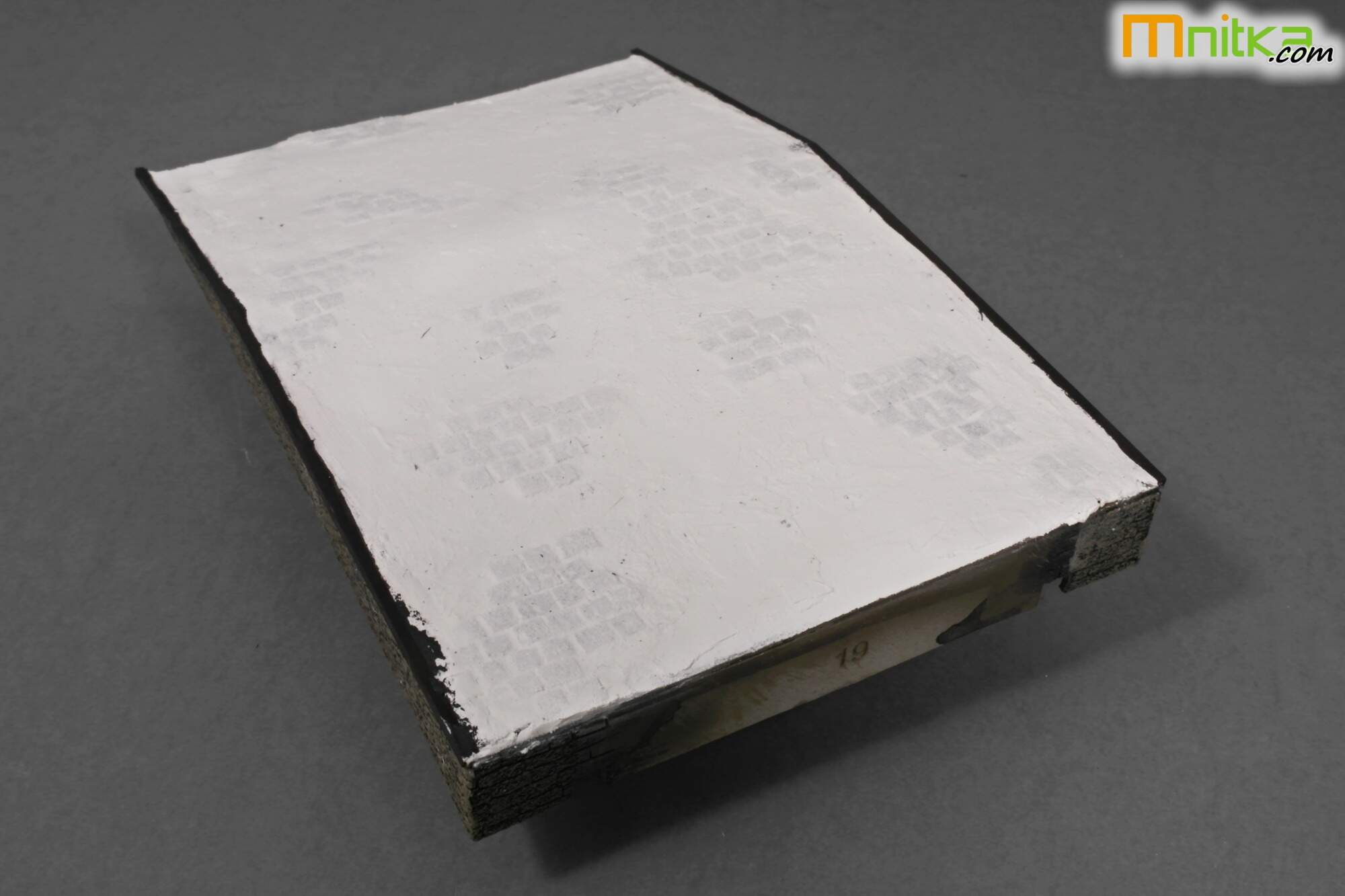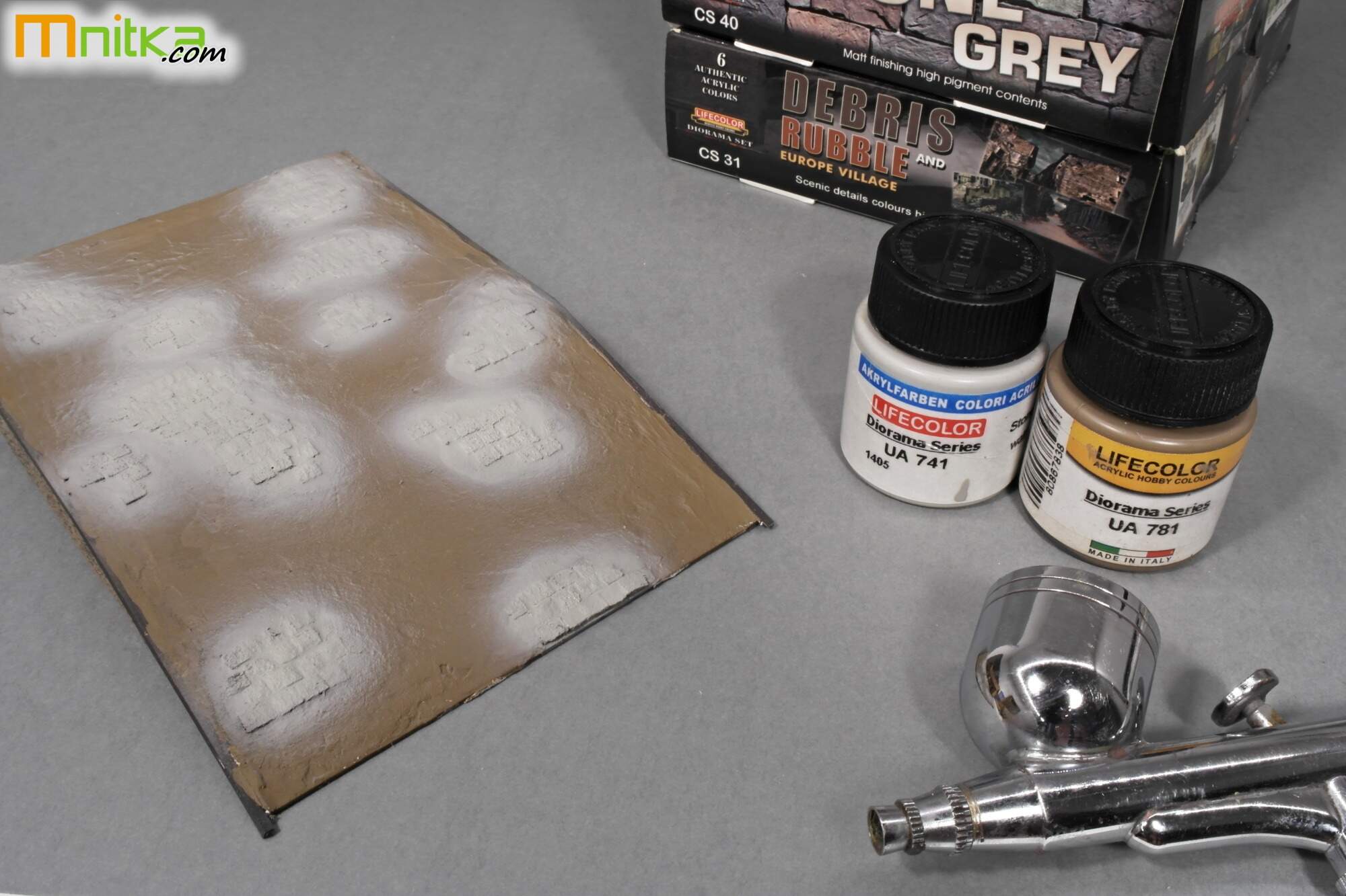 Dláždění rampy není ve stavebnici nijak naznačeno. Mým záměrem bylo znázornit rampu nevyužívanou, zarostlou vegetací s prostupujícími částmi dlažby. Jednotlivé kameny jsem nařezal ze styroduru a na plochu je lepil disperzním lepidlem. Na zpevnění hran jsem použil profil EVERGREEN L 1,5×1,5 mm.