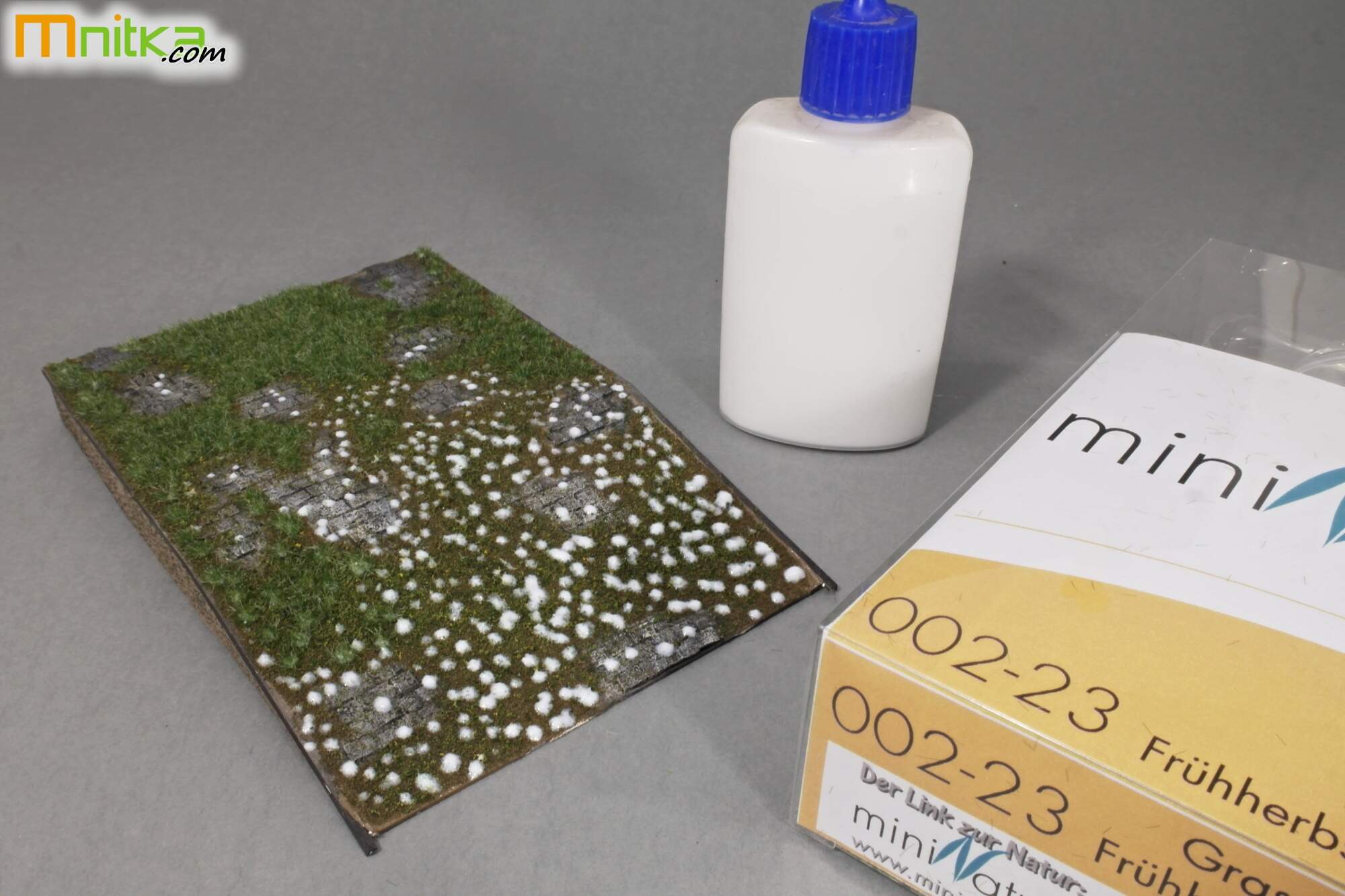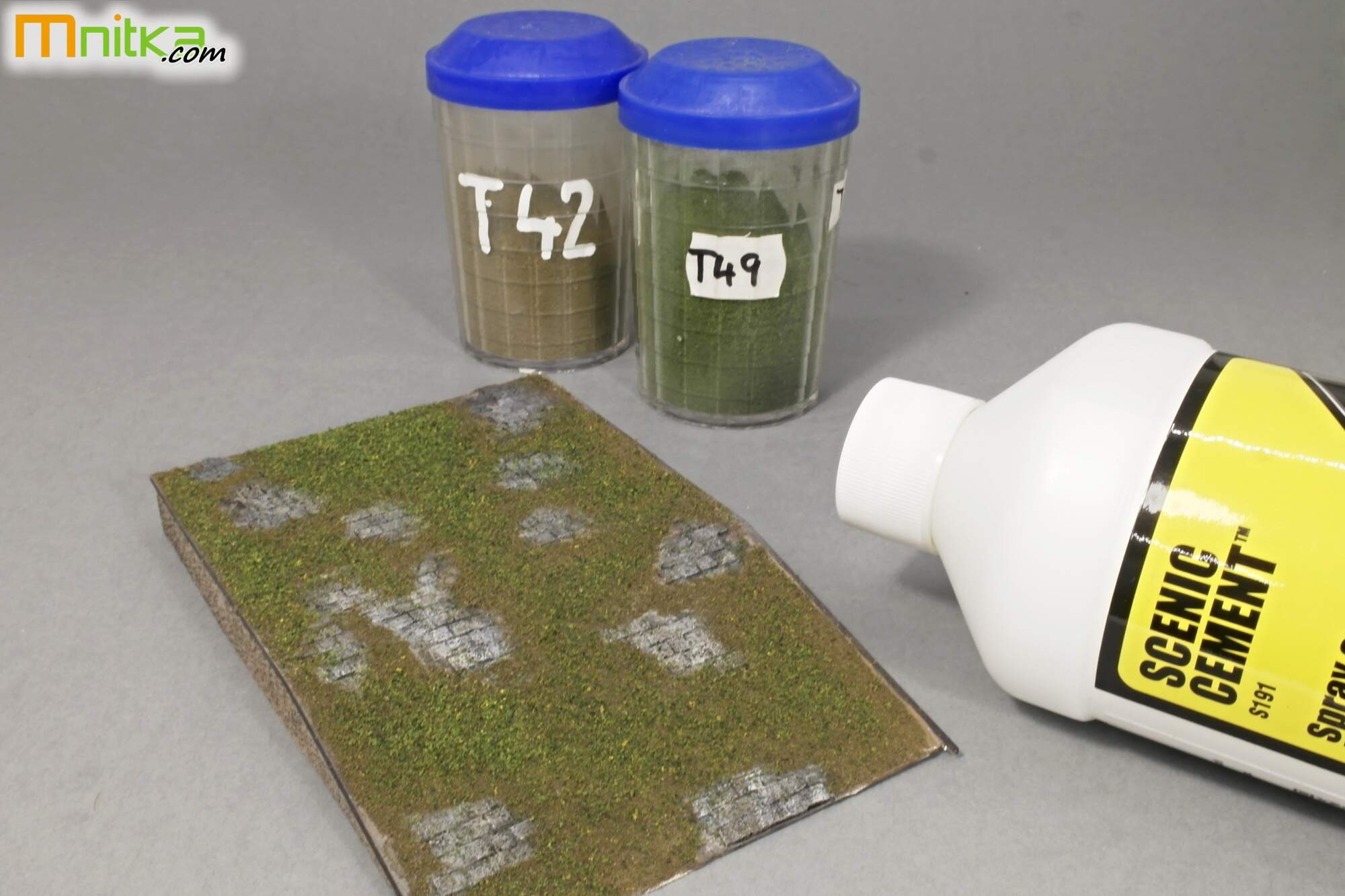 Pomocí gelového lepidla jsem vytvořil první vrstvu statické trávy délky 2mm na kterou navázala vrstva druhá ze směsi vláken délky 4,5 a 6mm.