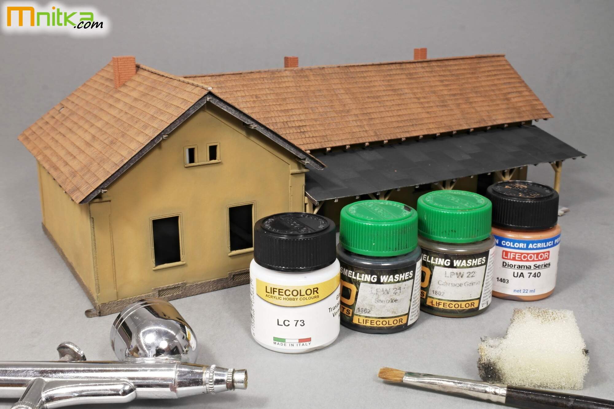 Další vrstvou na střešních taškách je lesklý lak, opět nanášený pistolí. Samotné zestárnutí střechy je provedeno v prvním kroku nátěrem směsi zředěných tekutých pigmentů LIFECOLOR LPW 21 a LPW 22, druhý krok představuje tupování jednotlivých pigmentů kouskem molitanu nebo štětcem nepravidelně na celý povrch střechy, finálním krokem je pak nanesení barvy střešní krytiny LIFECOLOR UA 740 metodou suchého štětce. Před posledním krokem musí být povrch střechy úplně suchý. Teprve teď za pomocí lepidla které není na bázi vody lepím střešní krytinu k samotné střeše, vyhnu se tak nevzhlednému pokroucení.