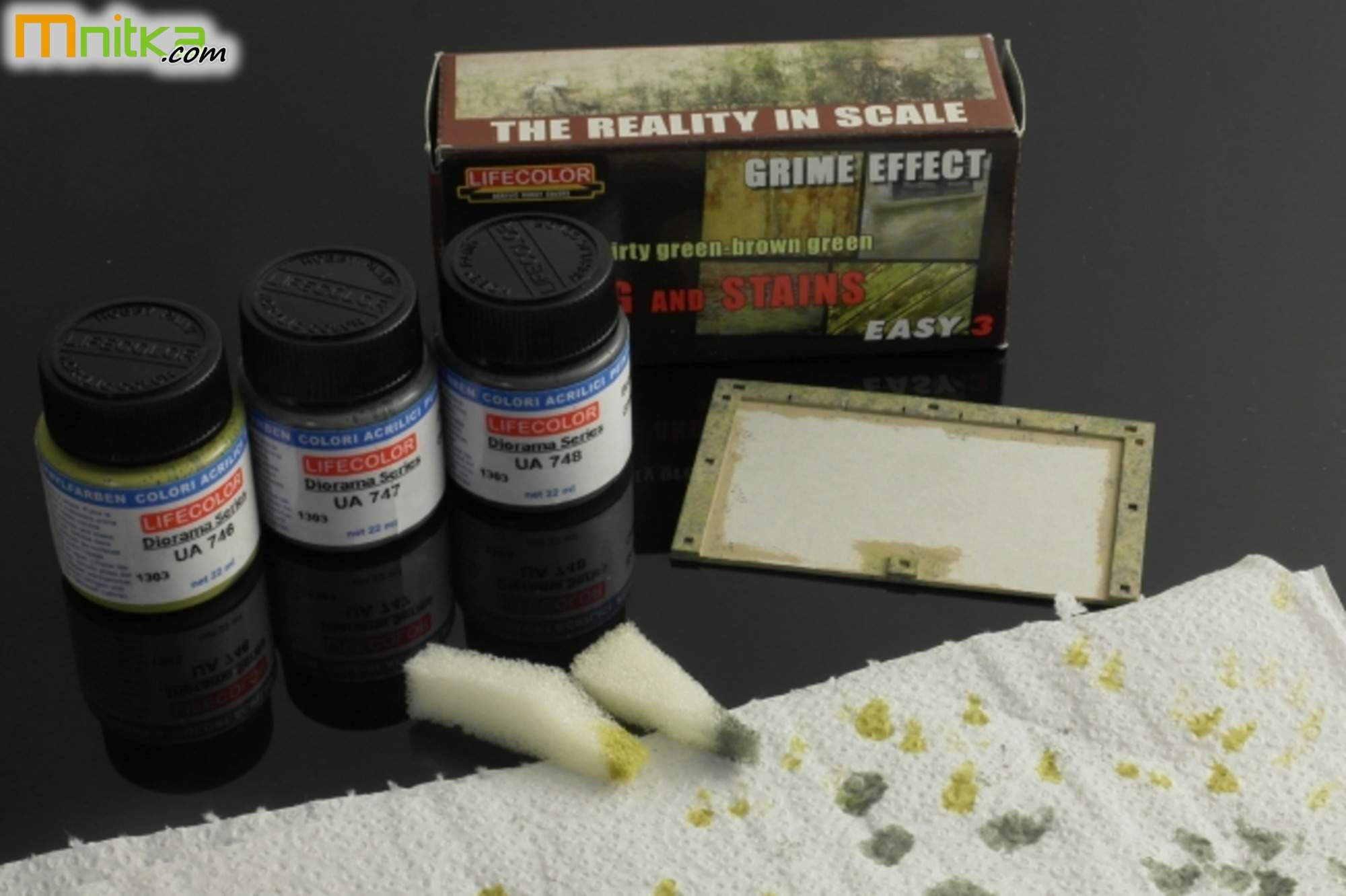 - barvy LIFECOLOR UA713 (tmavé dřevo) ze setu LIFECOLOR CS20 WEATHERED WOOD, UA020 (beton), LC39 (okapy a svody), set MS11 (patina betonového soklu) , stříkací pistole