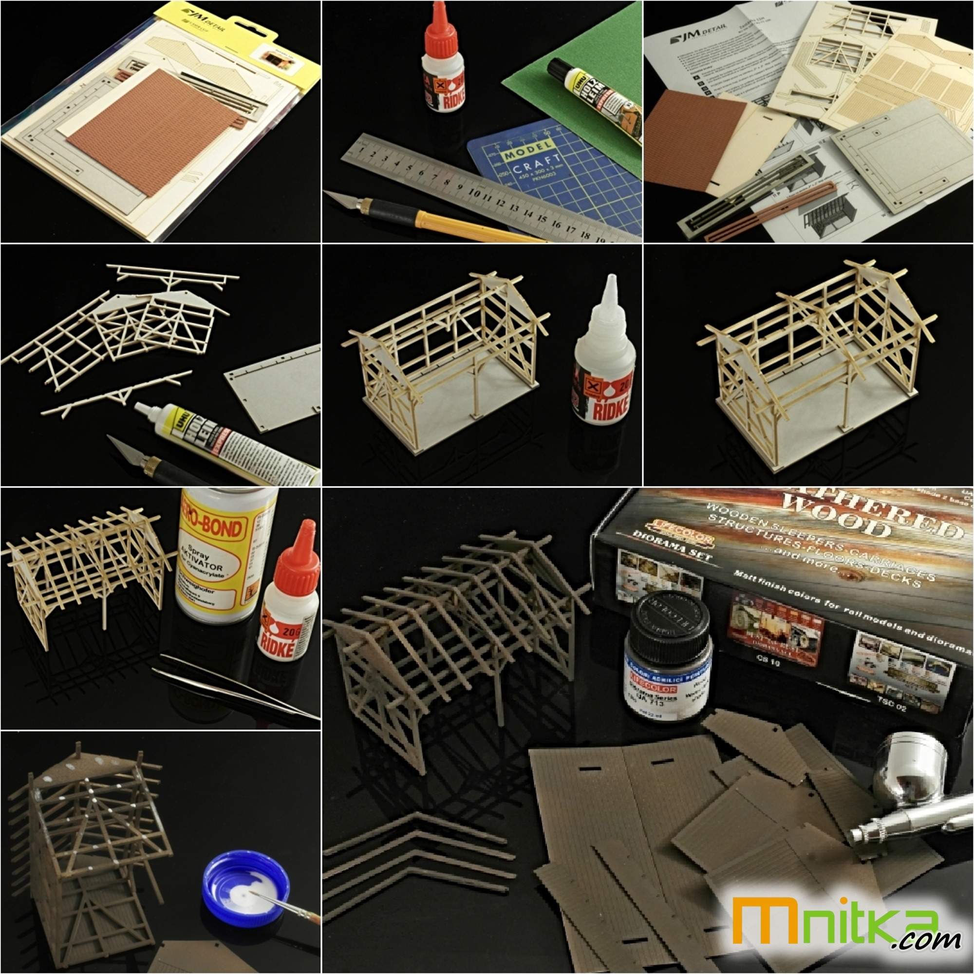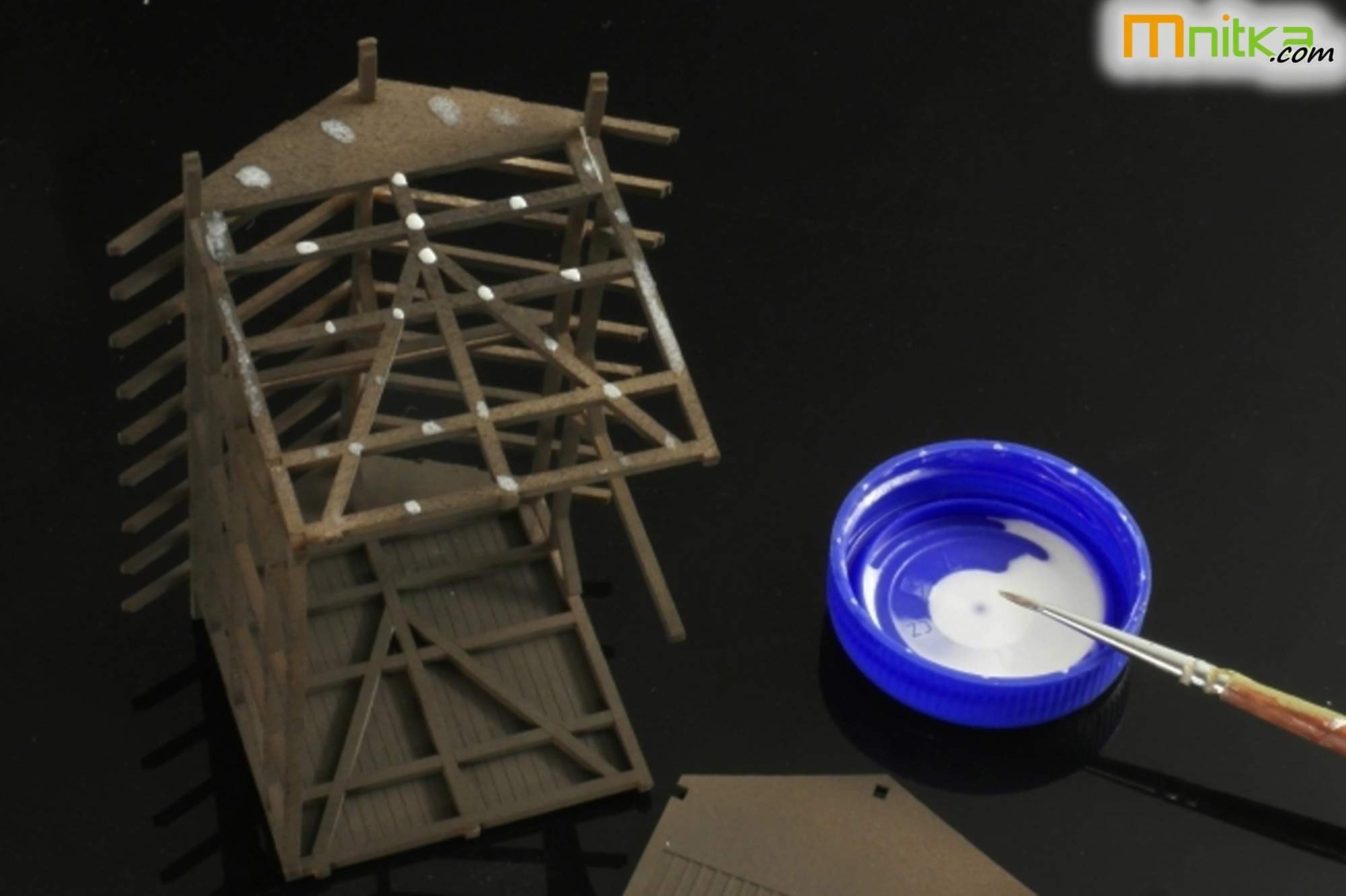 Nejprve jsem slepil základy budovy, které mě v dalším kroku pomohly s tvarovou fixací nasucho sestavené trámové konstrukce. Pozor na střední vrcholový trám, ten je třeba vsunout mezi štítové stěny ještě před lepením! K lepení trámové konstrukce jsem použil vteřinové lepidlo s občasnou pomocí aktivátoru – práci to výrazně urychlilo. Při lepení je třeba dbát na to aby se konstrukce k základům nepřilepila a zůstala odnímatelná. Lepení krokví jsem začal od prostředka abych se pohodlně dostal ke klešinám. Krokve jsem lepil jen k vrcholovému trámu, to je velmi důležité vzhledem k lepení dílů P a Z viz návod výrobce a jeden z obrázků níže. Celou sestavenou trámovou konstrukci včetně zbylých dílů kromě bobrovky jsem nastříkal barvou UA 713 ze setu LIFECOLOR WEATHERED WOOD CS20 .