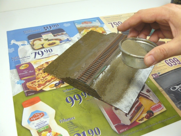 místa natřená lepidlem posypu hliněným prachem z jemného sítka